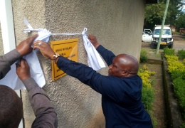 Mkuu wa wilaya ya Kyela Mheshimiwa Ismail Mlawa akizindua zoezi la uwekaji wa vibao vya anwani za makazi katika nyumba, ofisi na barabara wilayani Kyela.