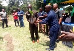 Mkuu wa Mkoa wa Mbeya Mhe. Juma Homera(kulia), akimkabidhi mche wa mchikichi mmoja wa wakulima wa chikichiki Kyela ,ikiwa ni ishara ya uzinduzi wa ugawaji wa miche hiyo bure kwa wakulima.