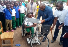 Mkuu wa wilaya ya Kyela Mhe.Ismail Mlawa akimkabidhi baiskeli mwanafunzi Johnson Kilale, wa shule ya sekondari Kyela Day, ambae ni mlemavu wa miguu.