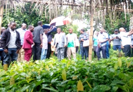 Mkuu wa wilaya ya Kyela Mheshimiwa Ismail Mlawa (Katikati) akiangalia moja ya kitalu cha miche ya Kakao kilichopo kata ya Ipinda wilayani Kyela.