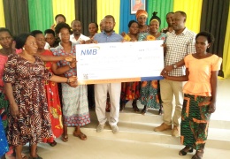 Mwenyekiti wa Halmashauri ya wilaya ya Kyela Mheshimiwa Katule G. Kingamkono(shati la drafti) akikabidhi hundi ya mfano ya shilingi 150,000,000/= kwa vikundi 12 vya wanawake, vijana na watu wenye ulem...