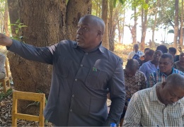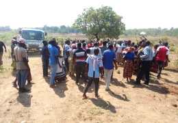 Wananchi wa Kata ya Ibanda wilayani Kyela Waliojitokeza katika mkutano wa Hadhara na kujionea tripu za mawe zikishushwa kwaajiri ya ujenzi wa shule mpya ya Ibanda Sekondari.